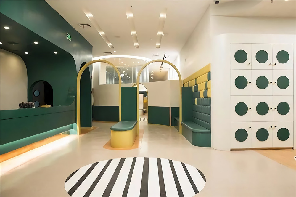维尼宝贝亲子游泳中心装修设计旨在营造一个给孩子和家长惊喜、有趣的空间体验。绿色、黄色、粉色、黑色、蓝色,多变的色彩在满足孩子主体性的同时,又兼顾家长的审美,采用简约的设计手法,实现各区域的双色碰撞,设计出极具视觉冲击力的创意空间。