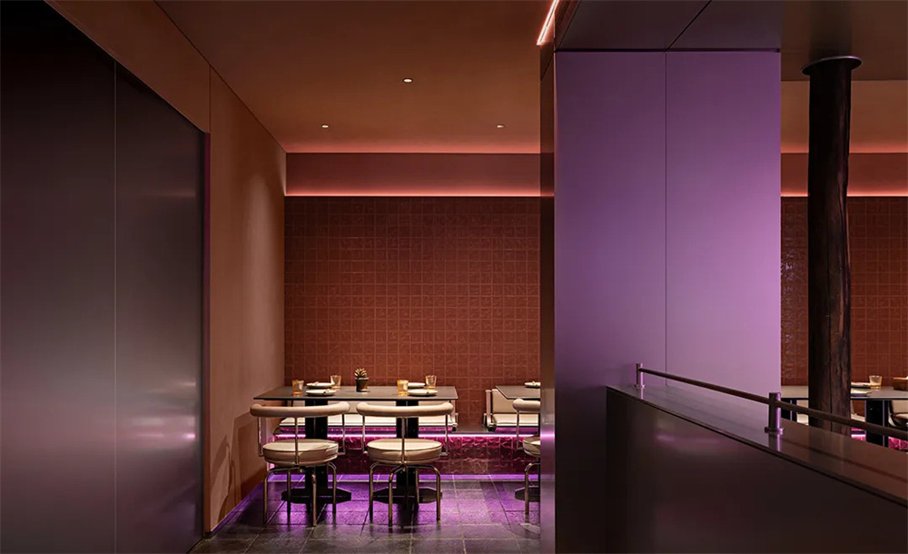 银色不锈钢的冷峻在皮质软包的搭配下,多了一丝温柔,诡谲奇幻的荧光紫灯光投射在肌理之上,将复古机械感滑向未来宇宙。垂直方向上,设计师在U型吧台位置开设矩形天窗,倾泻而下的自然光纵贯空间,使中央吧台兼具宴饮活力和自然韵律,流水、景观、植物片段式穿插期间,让食客们于散座区回归平静而松弛的状态。