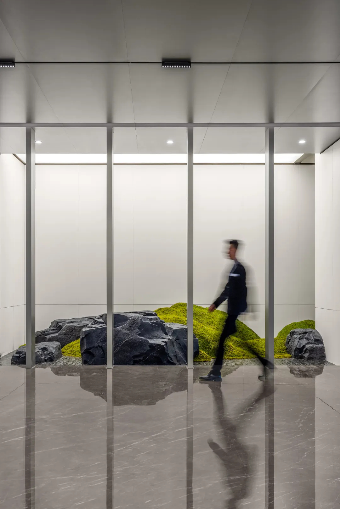 在裙楼与主楼相接的通道,自然景观和人造景观相结合,软膜灯箱模拟自然光,山、石、树、苔,让人流连忘返。在现代的商务环境,引入山水自然,仿佛置身于庭院中,营造放松舒适的感受 。平和适宜,沉静典雅,卸下一身浮躁,优雅的气质从落客开始。