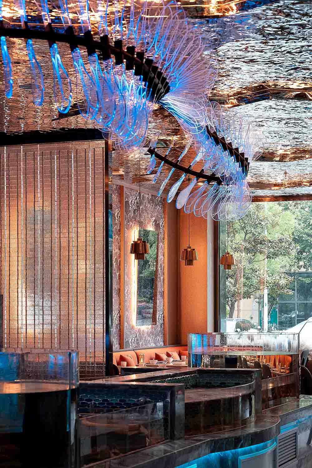 在大堂贝类池的上部结构中,设计师使用了船龙骨的结构元素。变色的“蜈蚣灯”以六变水纹不锈钢变身为“水面”,荡漾的水波不仅呼应了餐厅的特色,也让室内空间充满了周边的环境元素,创造视觉上动态和自然的纹理。