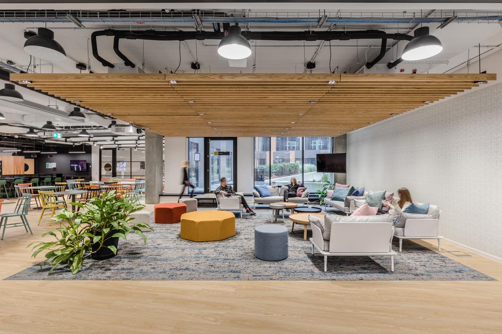 舒适休闲的氛围、亲生物设计、共享交互、灵活适配、自主选择、景观视野,这些词语成为后疫情时代办公室设计的重要属性。Amway安利波兰办公室的设计亦根植于这些要素,室内以轻盈的浅灰色为背景,点缀以青春明亮的色彩,让这个家族企业以时尚前沿的姿态诚邀员工加入这温馨活力的大家庭。